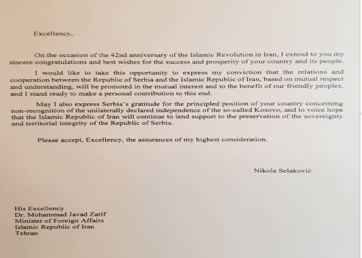 Congratulation message of H.E. Mr. Nikola Selakovic, Minister of Foreign Affairs of Serbia on the occasion of the National Day of Iran