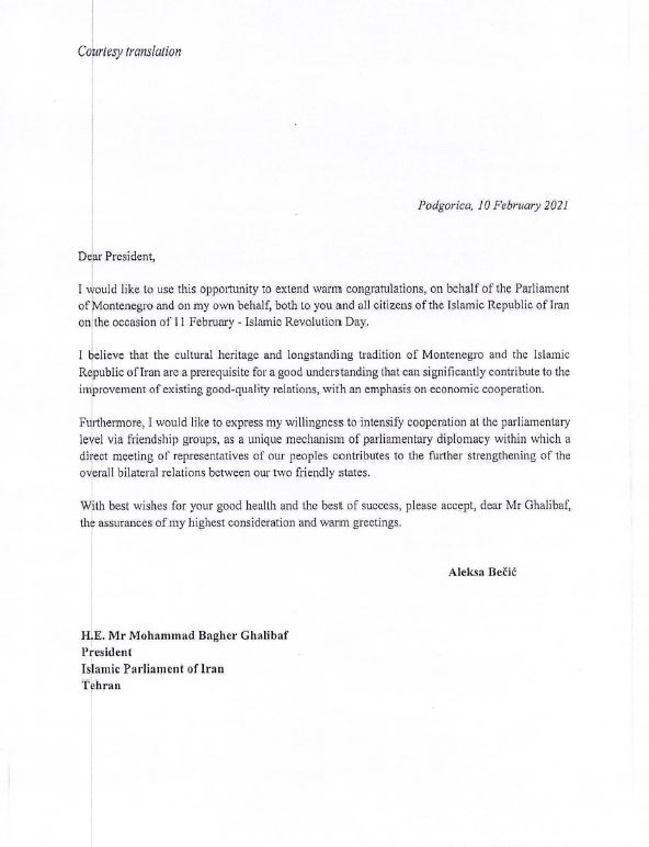 Aleksa Bečić President of the Parliament of Montenegro in his congratulatory message to Iranian counterpart Mohammad Bagher Ghalibaf speaker of the Parliament of Iran urged bolstering cooperation at the parliametary level