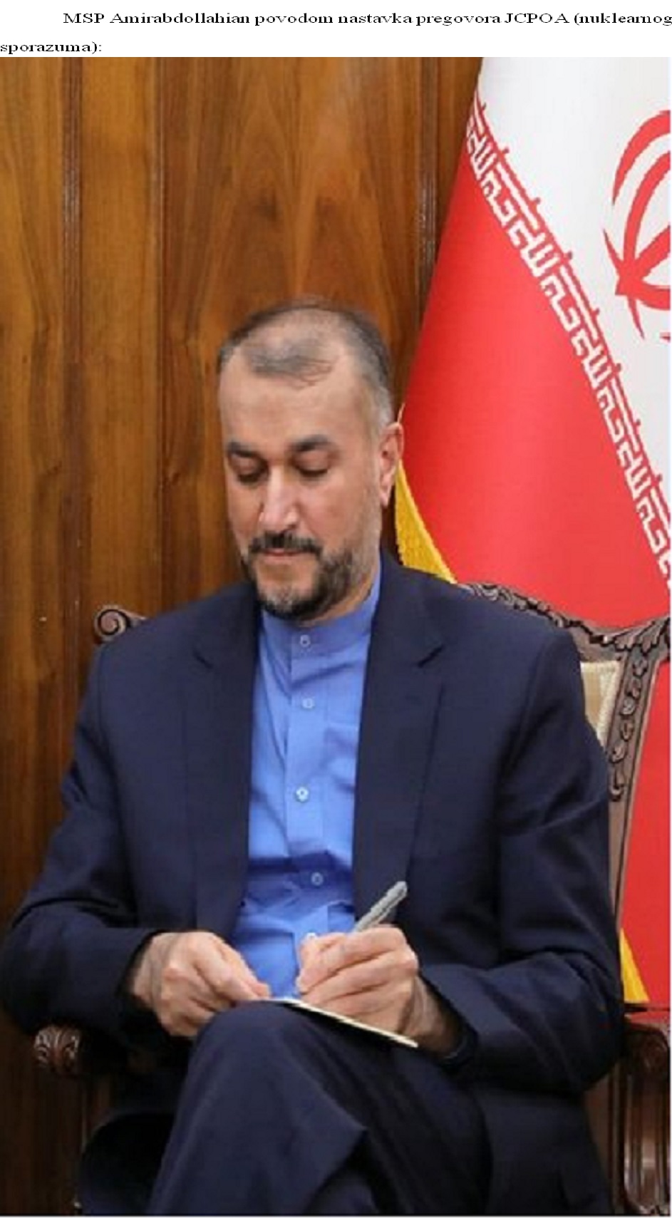 Putem kojim se išlo tokom šest rundi intenzivnih pregovora u Beču nije vodio uspehu zbog američkih preteranih zahteva i nerealističnih stavova. Sada započinjemo jednu novu rudnu razgovora. Glavni cilj ovih pregovora je obnavljanje prava iranskog naroda i ukidanje svih sankcija nametnutih Iranu unilateralno i ekstrateritorijalno od strane SAD koje više nisu deo Zajedničkog sveobuhvatnog plana akcije (JCPOA). SAD su se povukle iz JCPOA 8.maja 2018.godine - korak koji je viđen i osuđen na međunarodnom planu kao nezakonit. Postoji međunarodni konsenzus da ovakva nezakonita ponašanja SAD demonstriraju potpuni prezir prema međunarodnom zakonu i Povelji UN, narušava multilateralizam i predstavlja veliku opasnost po međunarodni mir i bezbednost.